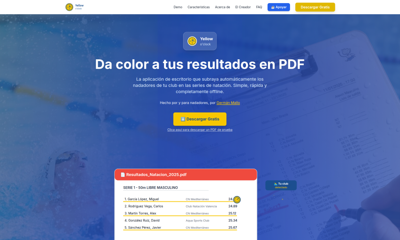 Yellow o'clock detecta automáticamente el nombre del club especificado dentro del documento y resalta visualmente a todos sus nadadores en segundos. La herramienta funciona localmente en el ordenador del usuario, garantizando privacidad y funcionalidad sin necesidad de conexión a internet.